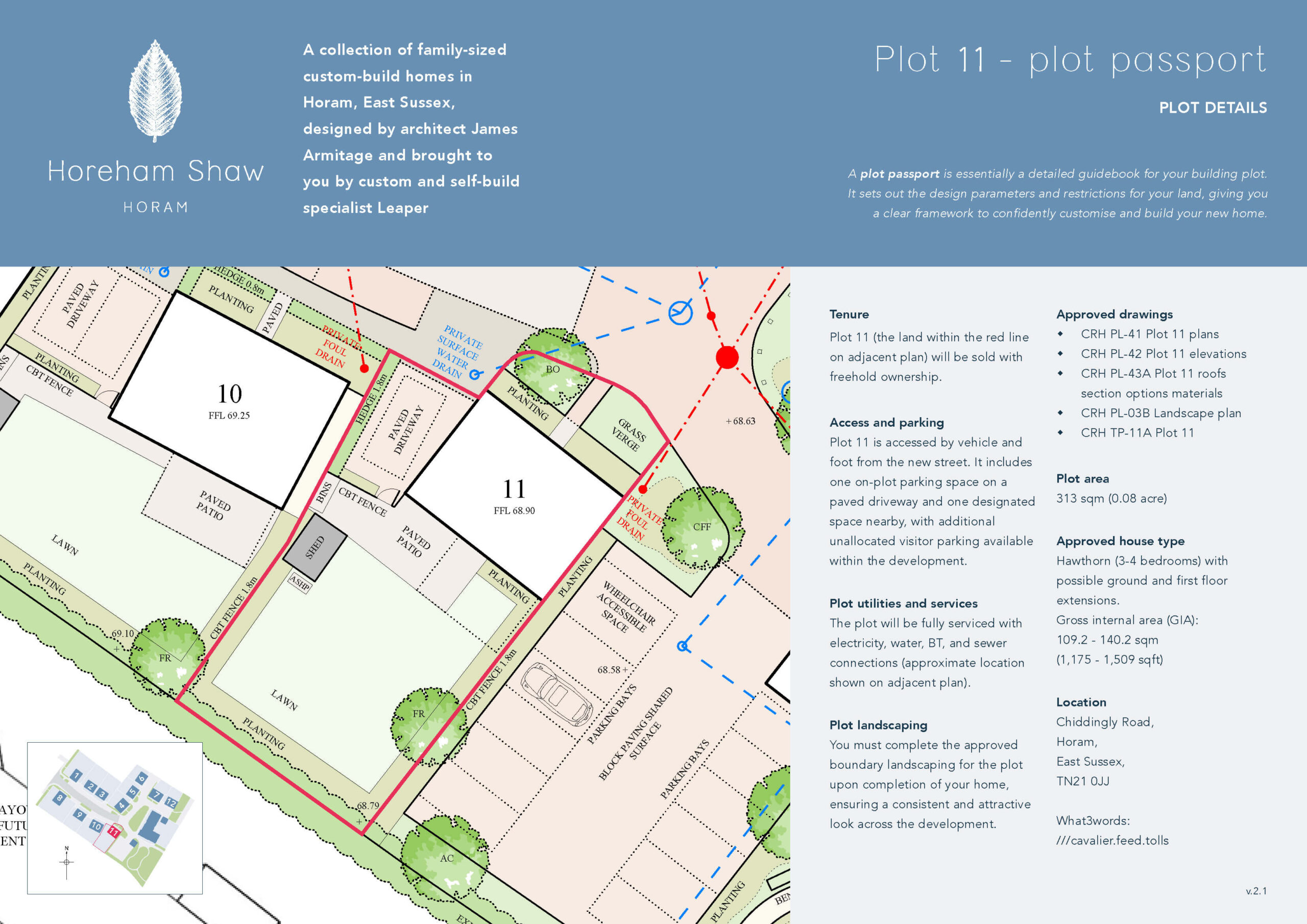 Horeham Shaw is designed as a private estate, with a Management Company maintaining the road, footpaths, drainage systems, communal landscaping, pond, and woodland. All plot owners will become members and pay an annual service charge to ensure long-term upkeep .